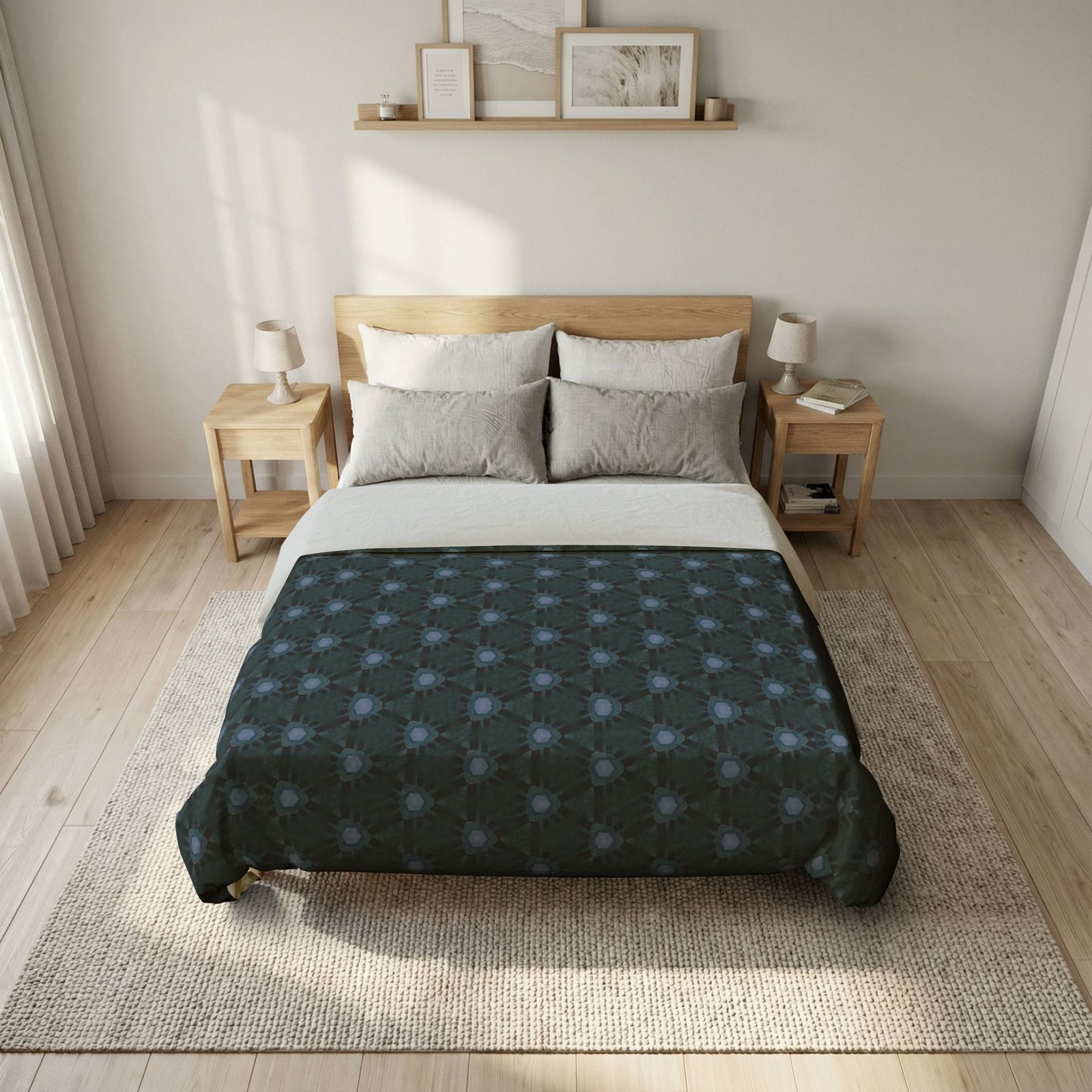 Lay your bedroom in quiet, thoughtful pattern. This 100% cotton duvet cover wraps your bed in a deep, muted geometric print — soft navy background with subtle, triangular