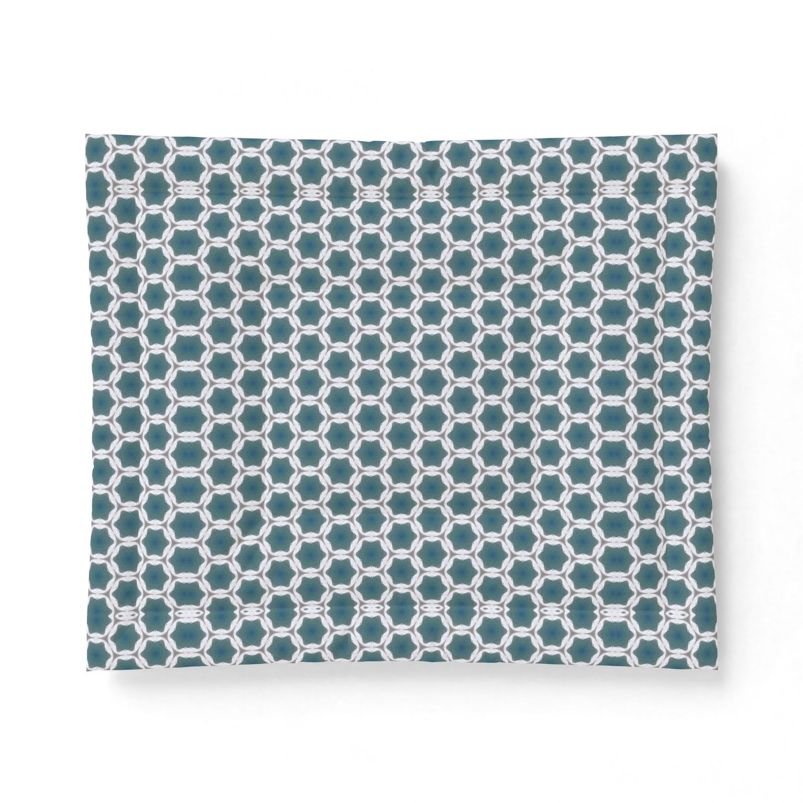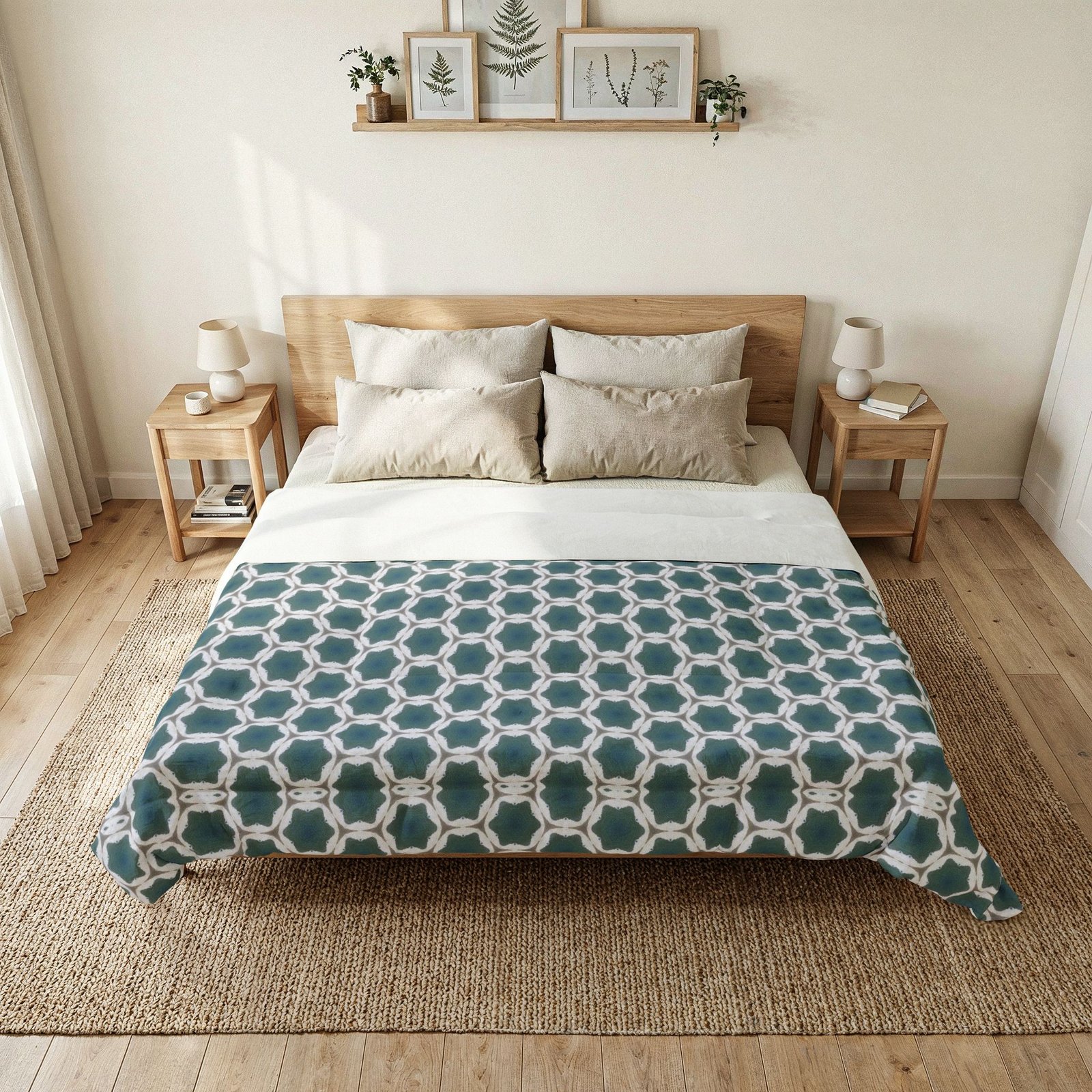 A lightweight cotton comforter woven from 100% Oeko‑Tex certified cotton that brings quiet pattern and breathable warmth to your bedroom. The double square quilting holds the plush 0.75″ batting in place so the comforter keeps a tailored silhouette while offering gentle insulation for cool nights. Printed edge‑to‑edge on one side with vivid, long‑lasting color, the geometric chain pattern in teal and cream adds a modern, slightly coastal rhythm to minimalist or Scandinavian interiors. The reverse is clean white, making it easy to layer with textured throws and neutral pillows for a calm, collected bedscape.