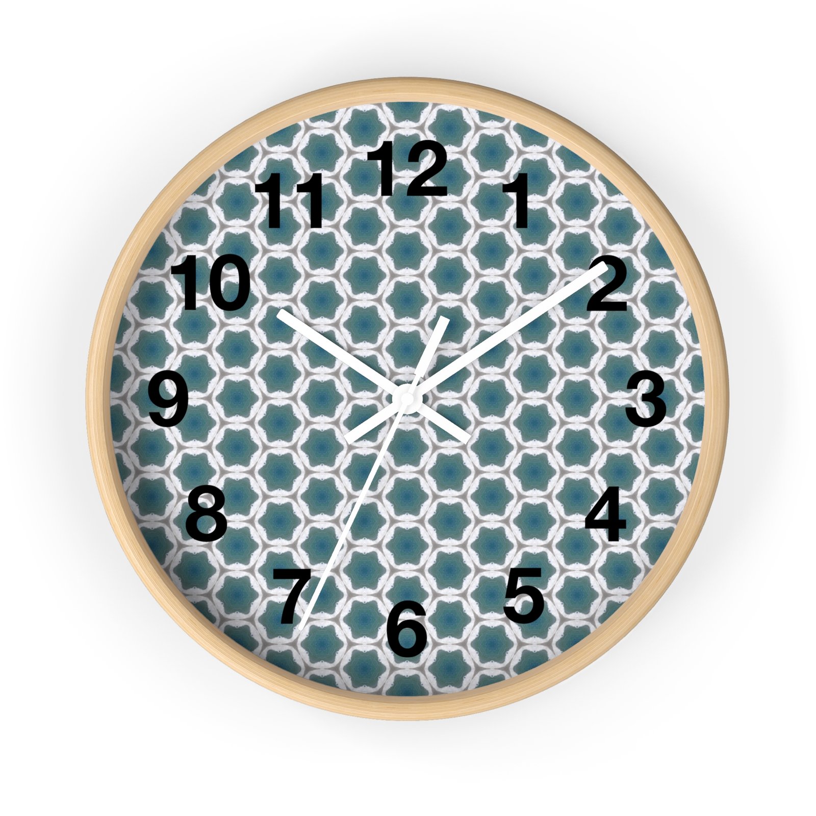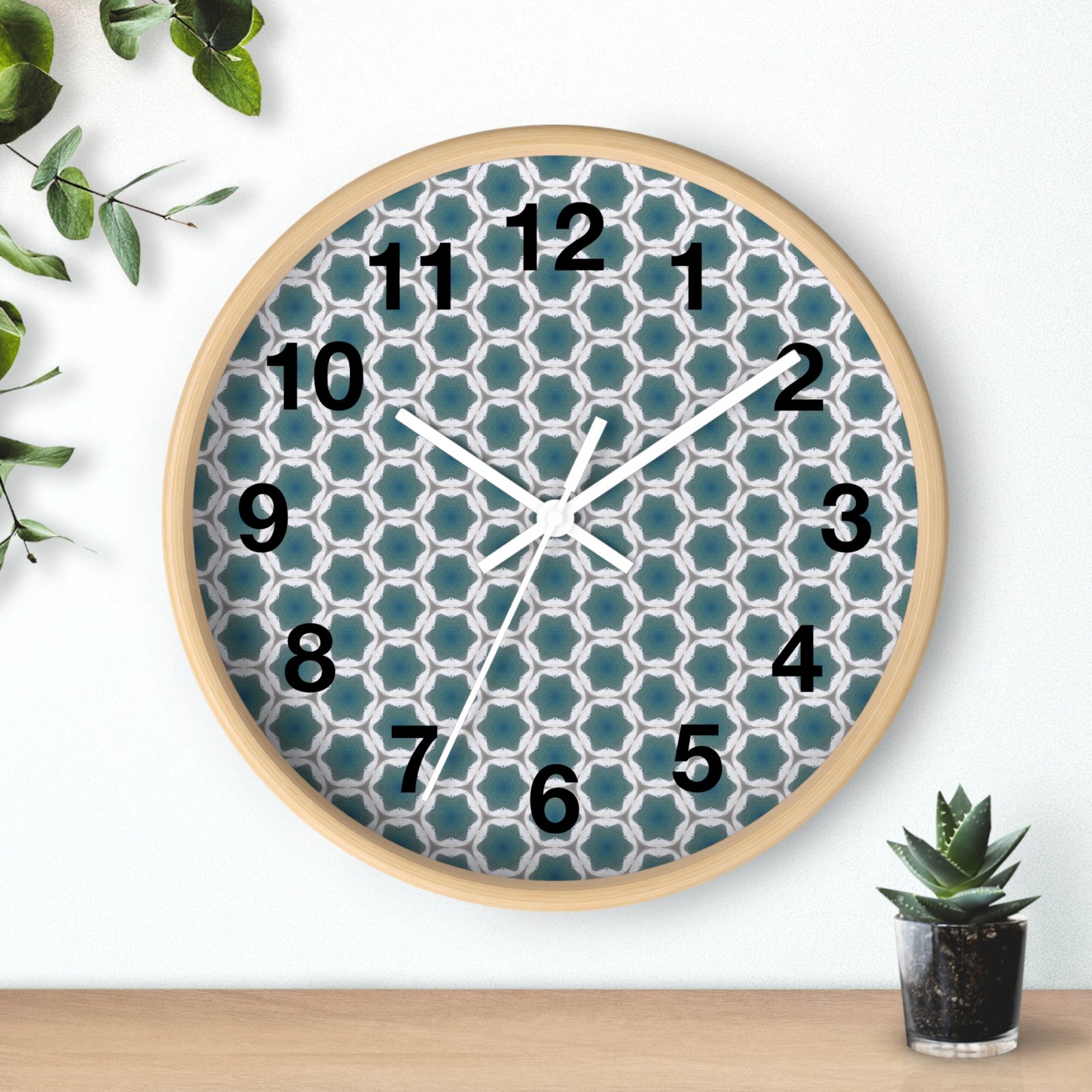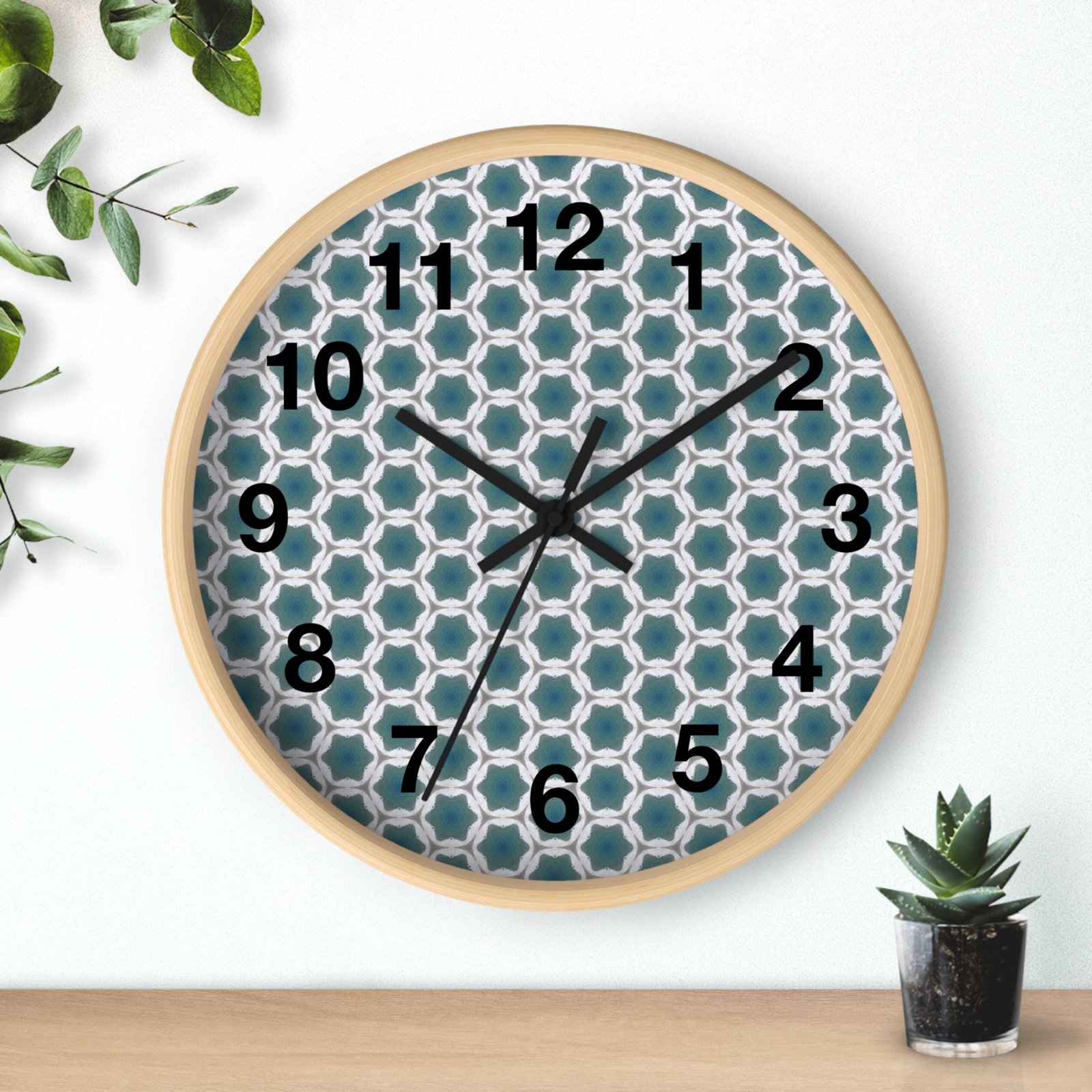 Soft morning light spills across a quiet kitchen as this 10″ wooden wall clock keeps time with a calm, coastal rhythm, as with the repeating bluish kaleidoscope pattern