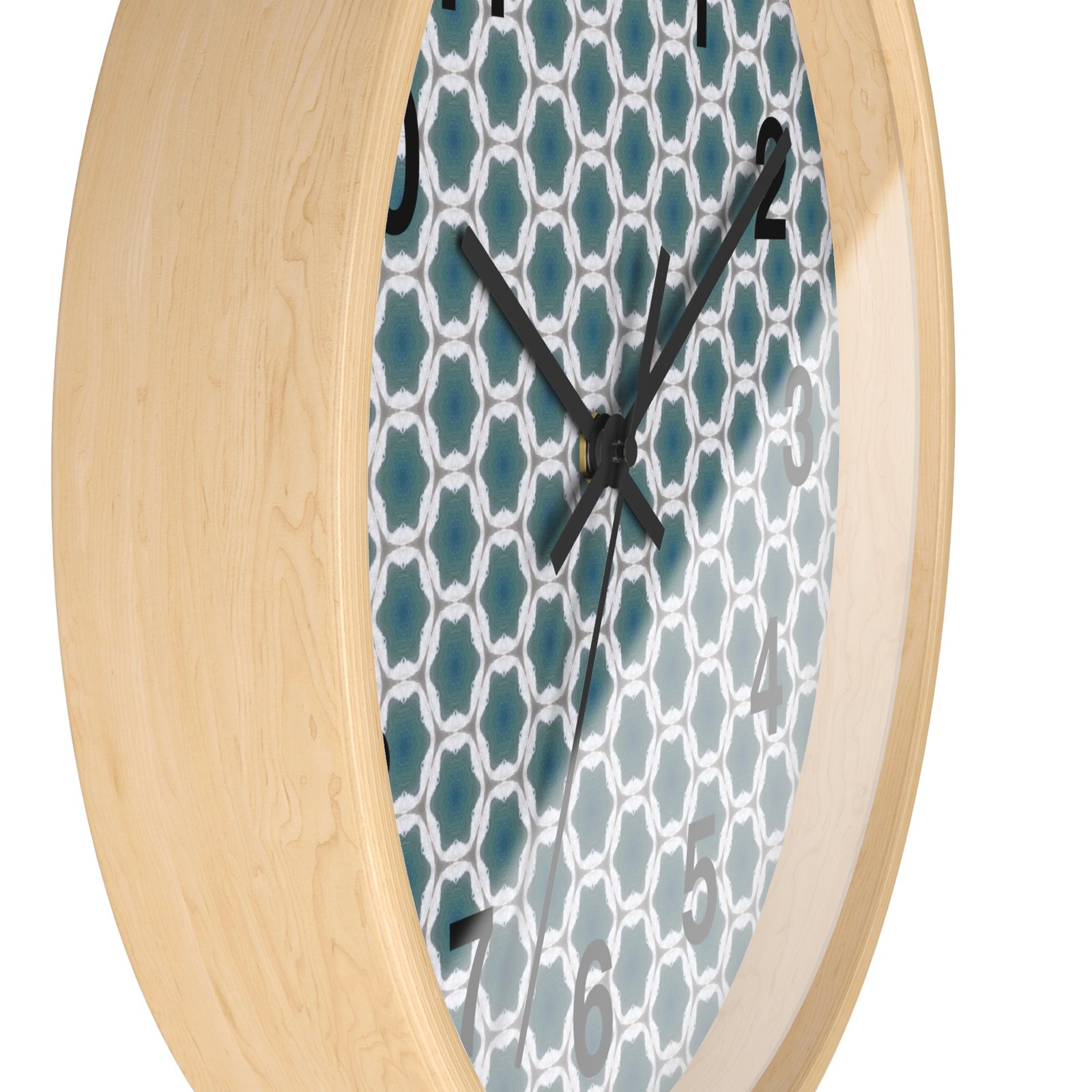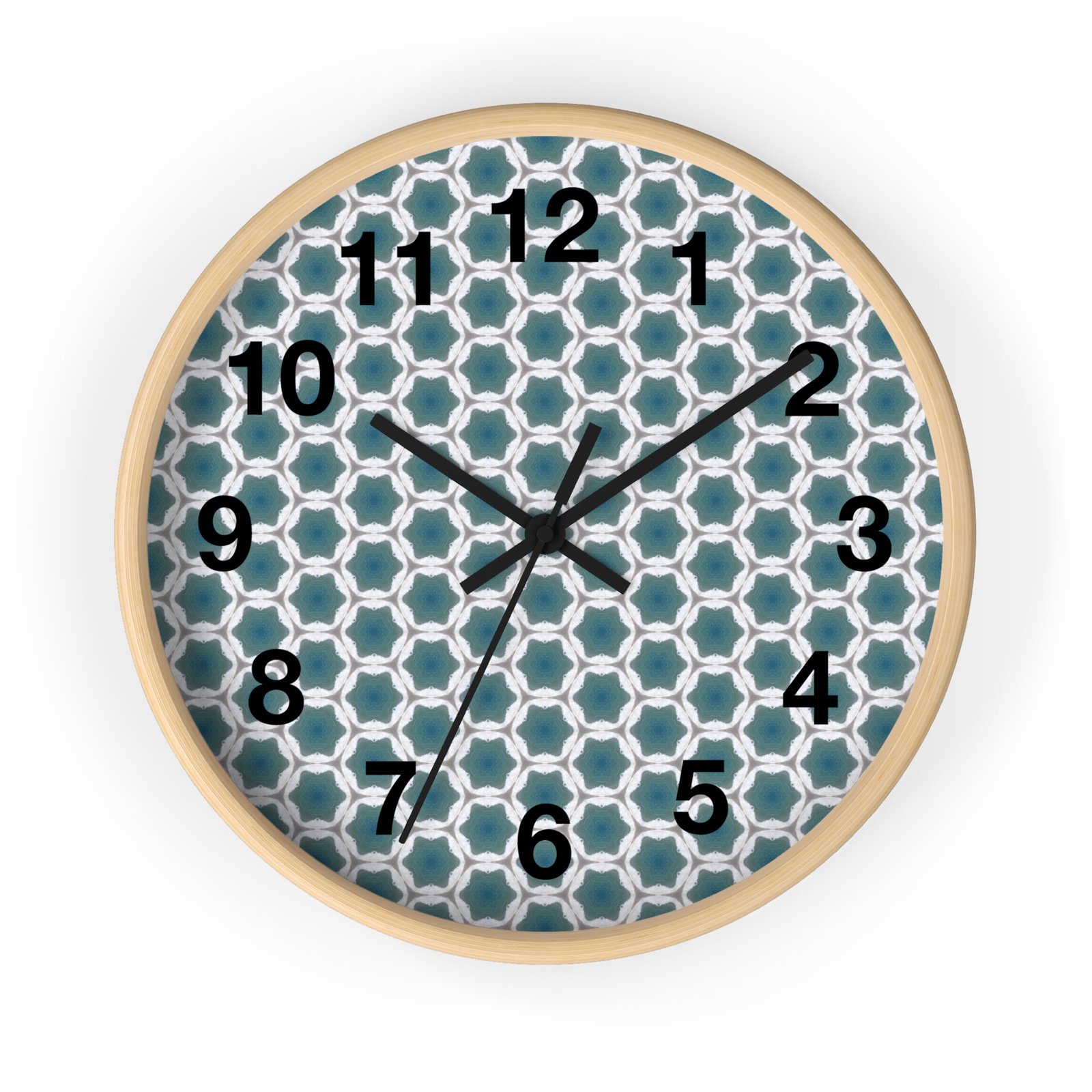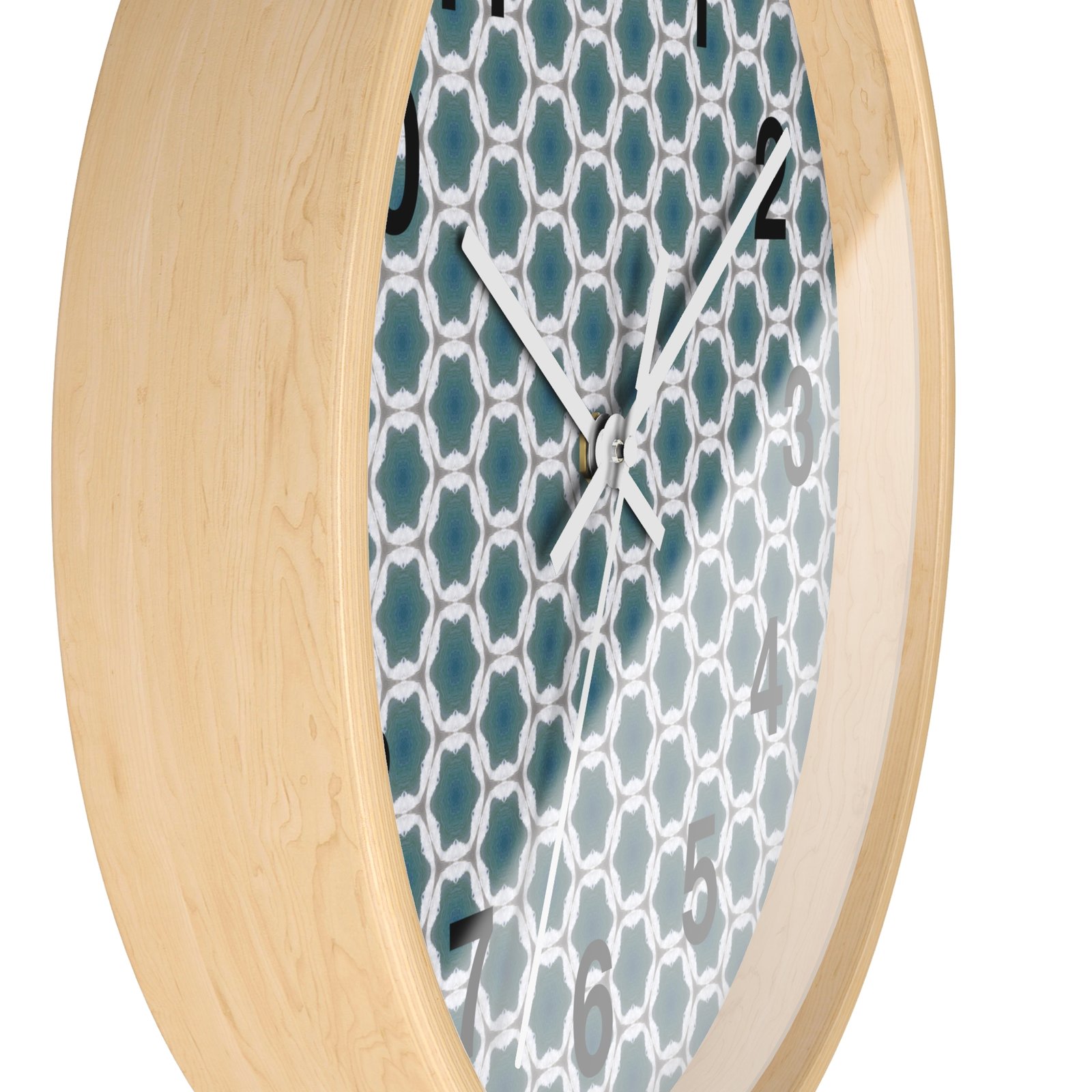 Soft morning light spills across a quiet kitchen as this 10″ wooden wall clock keeps time with a calm, coastal rhythm, as with the repeating bluish kaleidoscope pattern