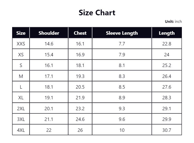 | Size Name | Shoulder | Chest | Sleeve Length | Length |