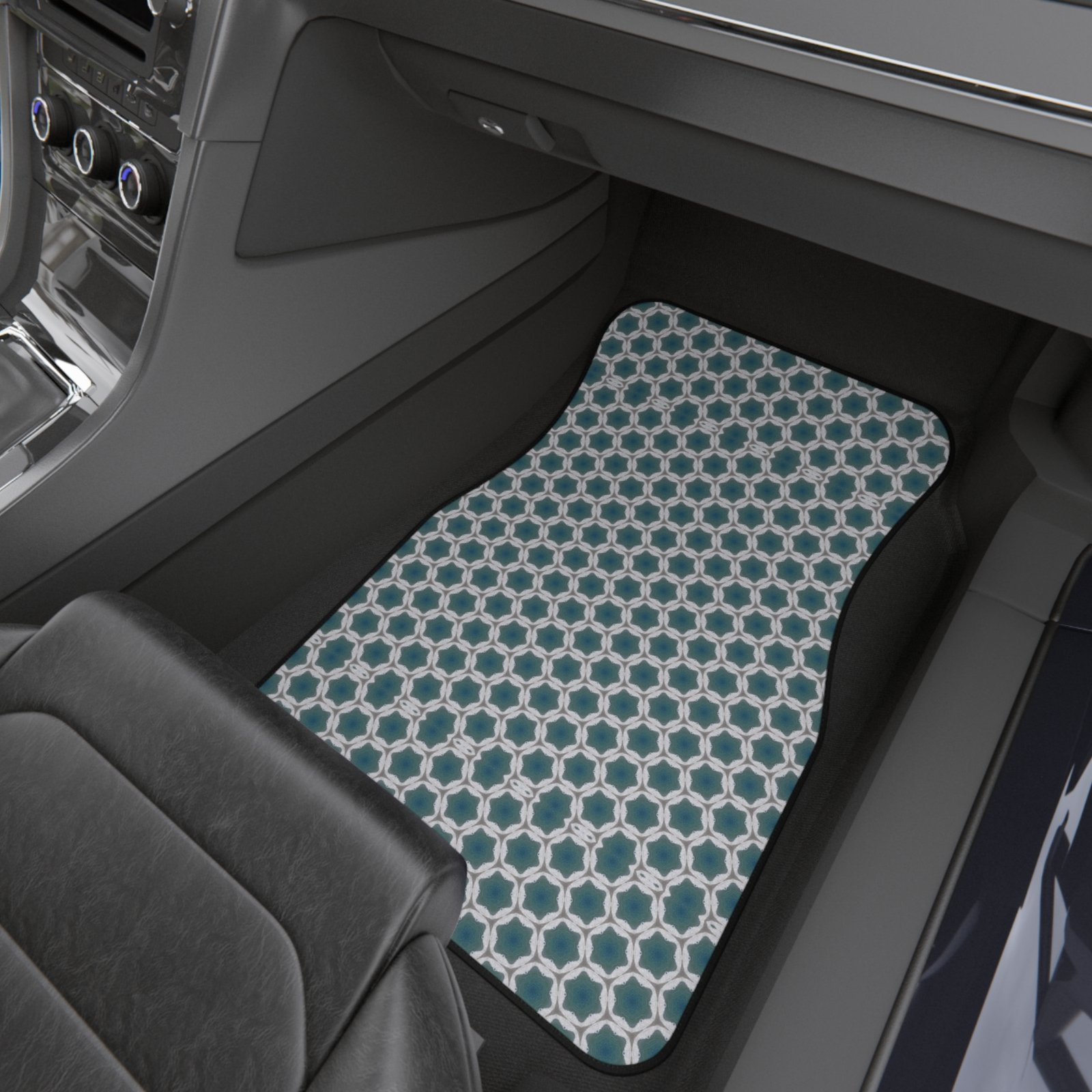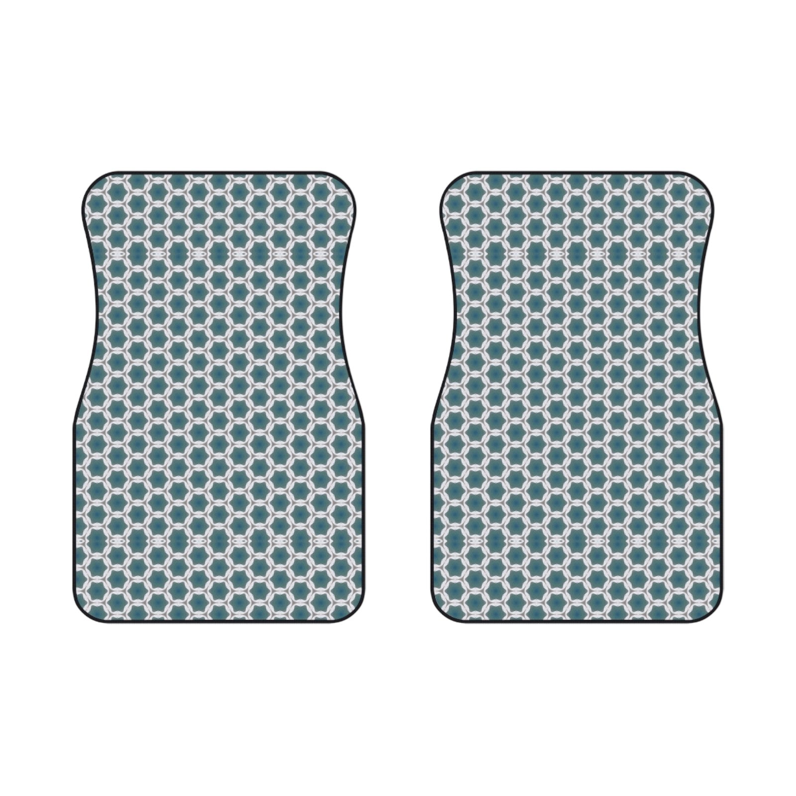 -and-cream geometric print reads modern but timeless — a calm, collected backdrop to daily commutes, grocery runs, and weekend escapes. They sit low and sure underfoot, the textured polyester holding color and contour while the rubberized backing keeps things from sliding when the road gets busy. Simple to rinse or vacuum, they bounce back from dirt and damp without fuss. For someone who cares about a tidy, thoughtfully styled interior, these mats add quiet personality and reliable protection.