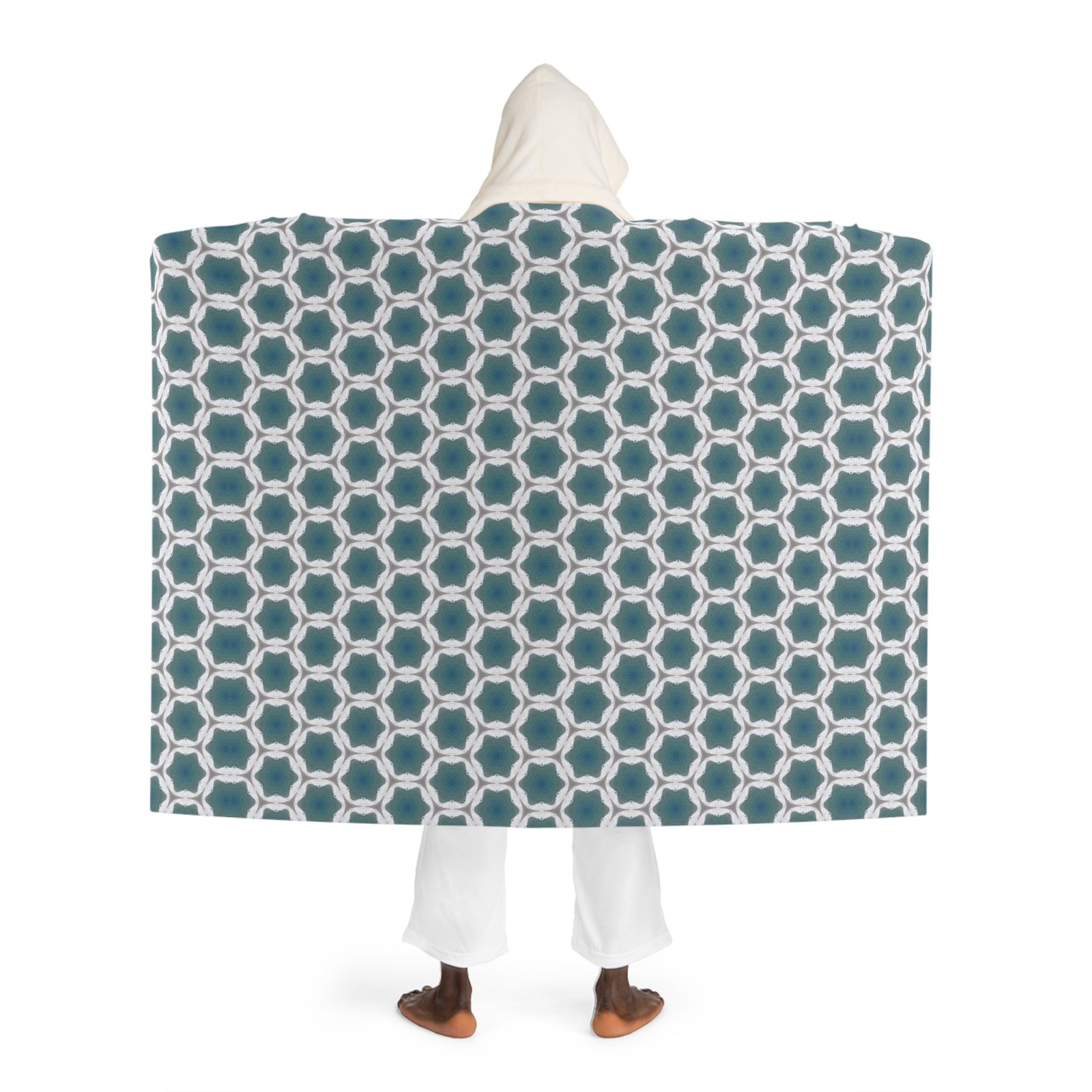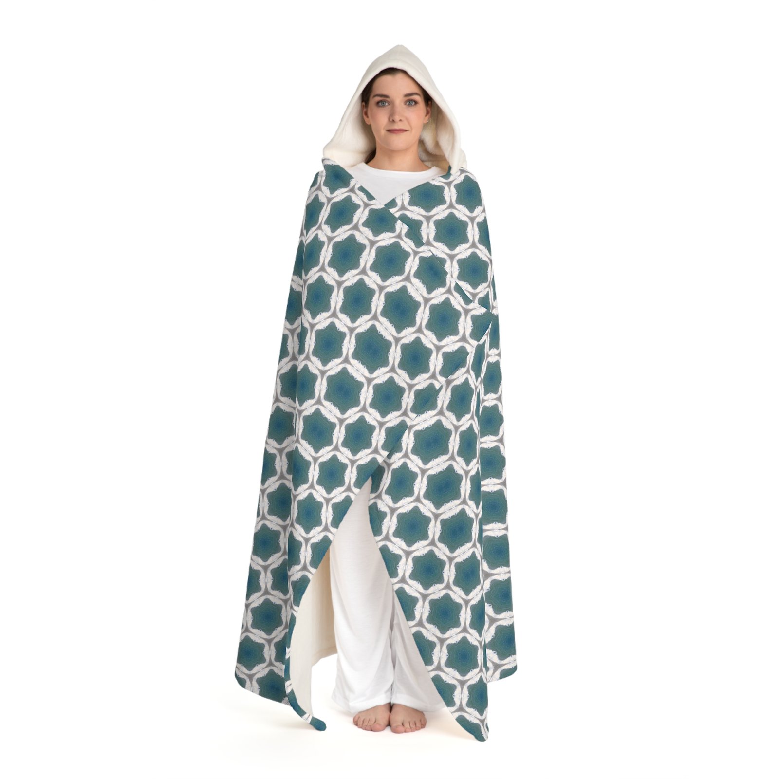 geometric pattern feels like a gentle ocean rhythm, while the cream sherpa hood and lining bring a soft, cozy contrast that tucks you into warmth. Lightweight but plush, the blanket drapes easily over shoulders for a hands-free layer on cool evenings. It’s the kind of piece you reach for when you want to slow down — a warm, familiar companion for reading nooks, slow mornings, and late-night movie rituals.