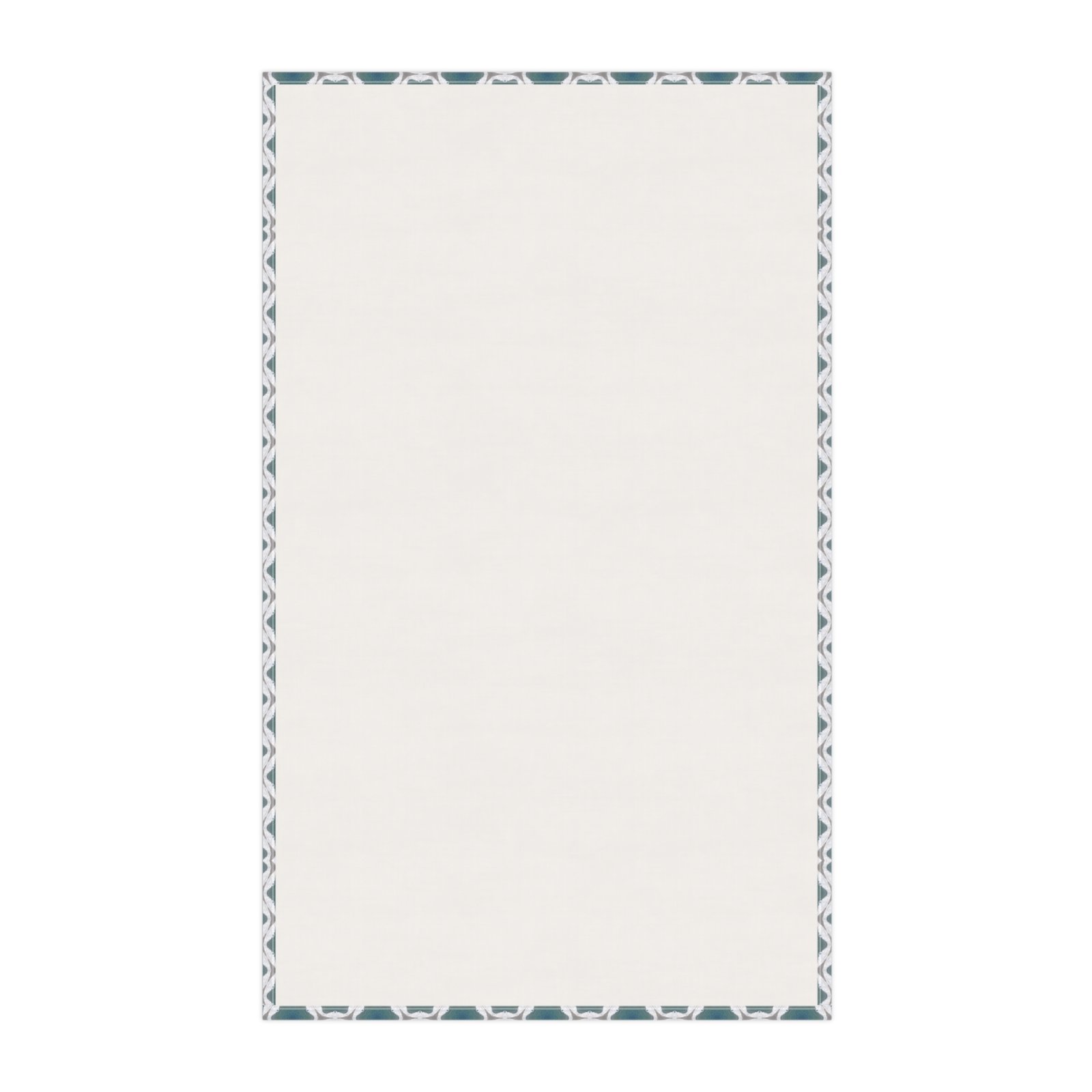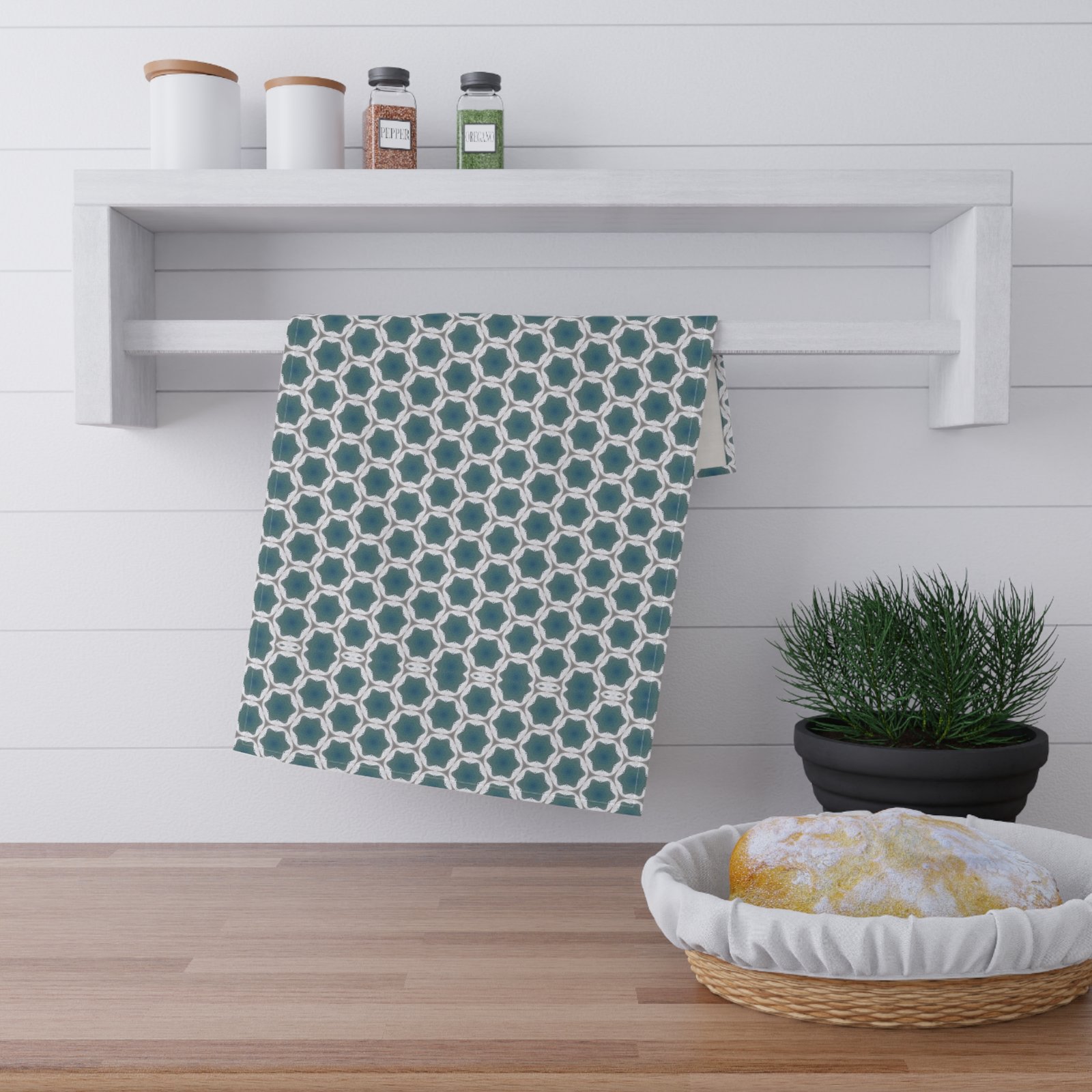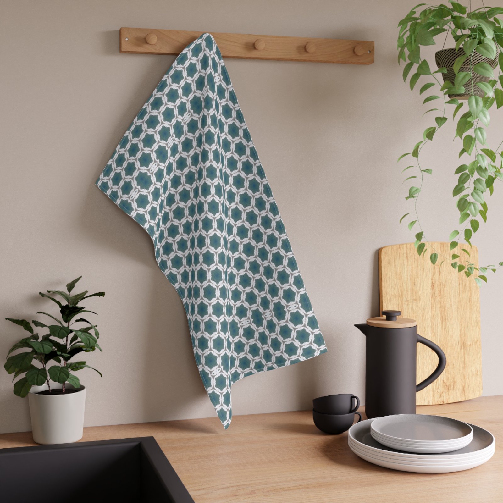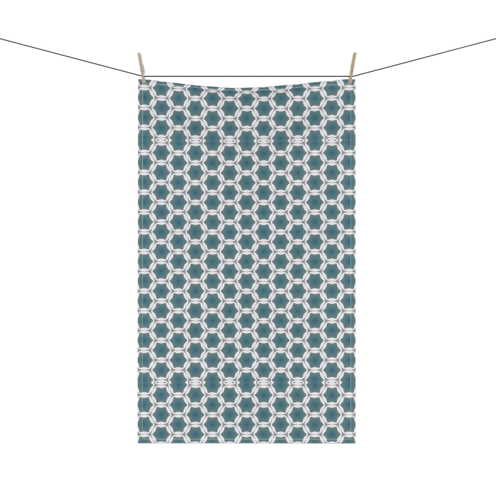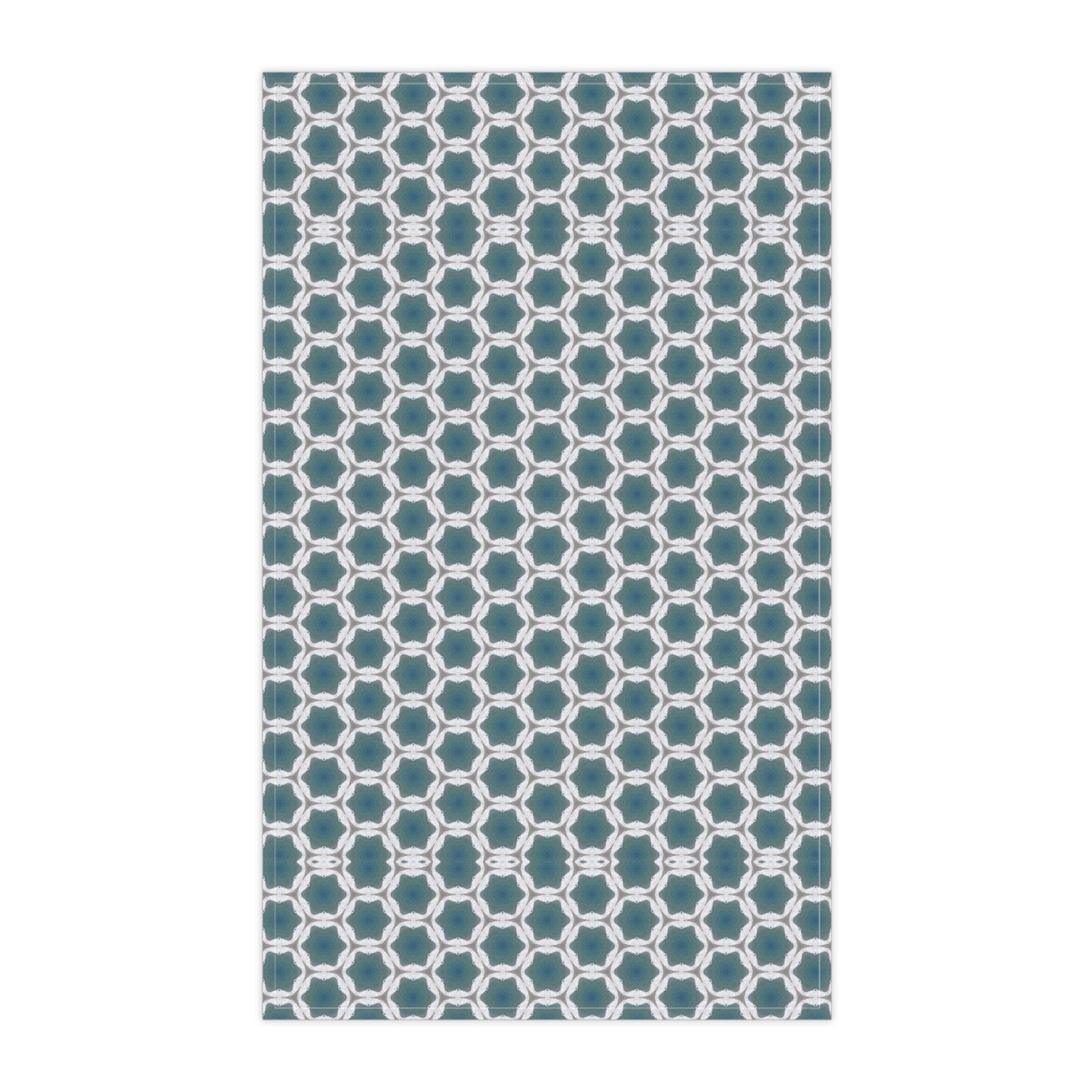 Soft, patterned tea towel that brings calm geometry to everyday kitchen tasks. The cool teal and white interlocking motif feels collected and a little vintage — like a quiet morning with a steaming mug and a book. Lightweight and neatly hemmed, this towel drapes easily over an oven handle or drying rack and dries dishes and hands without fuss. The single-sided print keeps the design crisp and concentrated where you see it most. It slips into routines for people who love thoughtful, well-designed home goods and who enjoy layering subtle pattern into a clean, modern kitchen. Works beautifully for casual brunches, slow weekend baking, or as a finishing touch when hosting close friends.