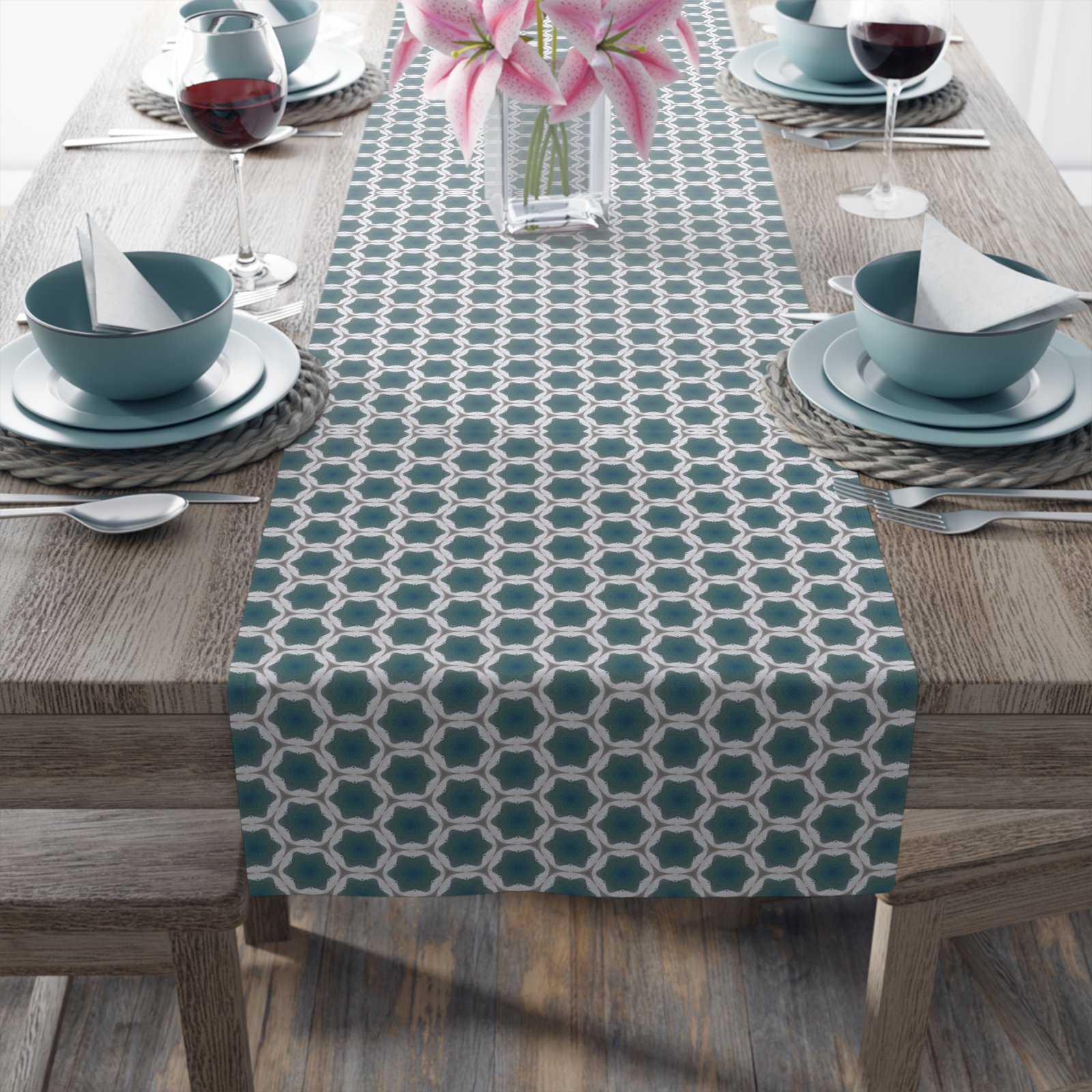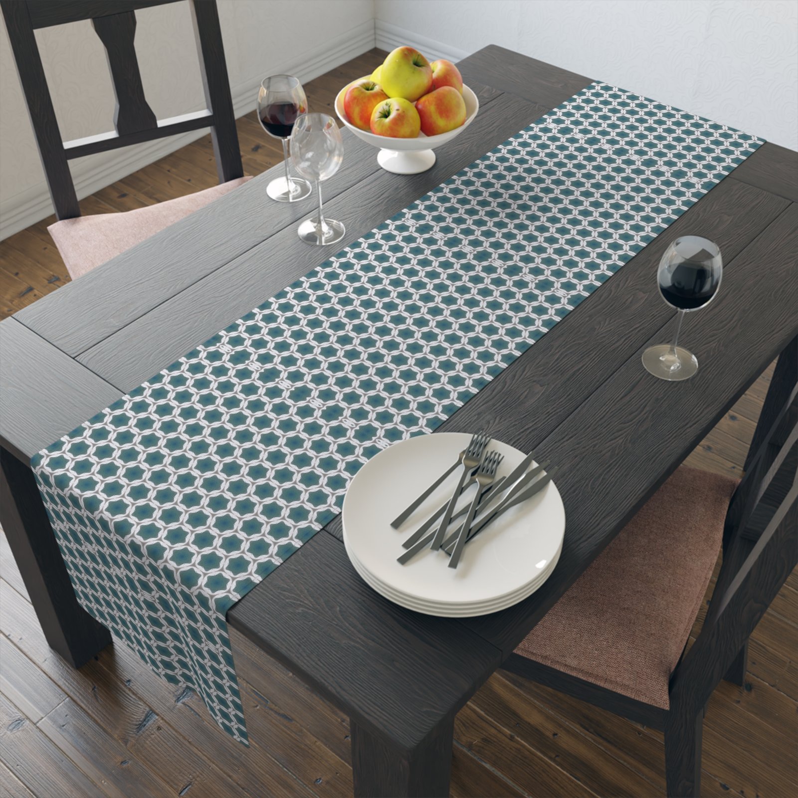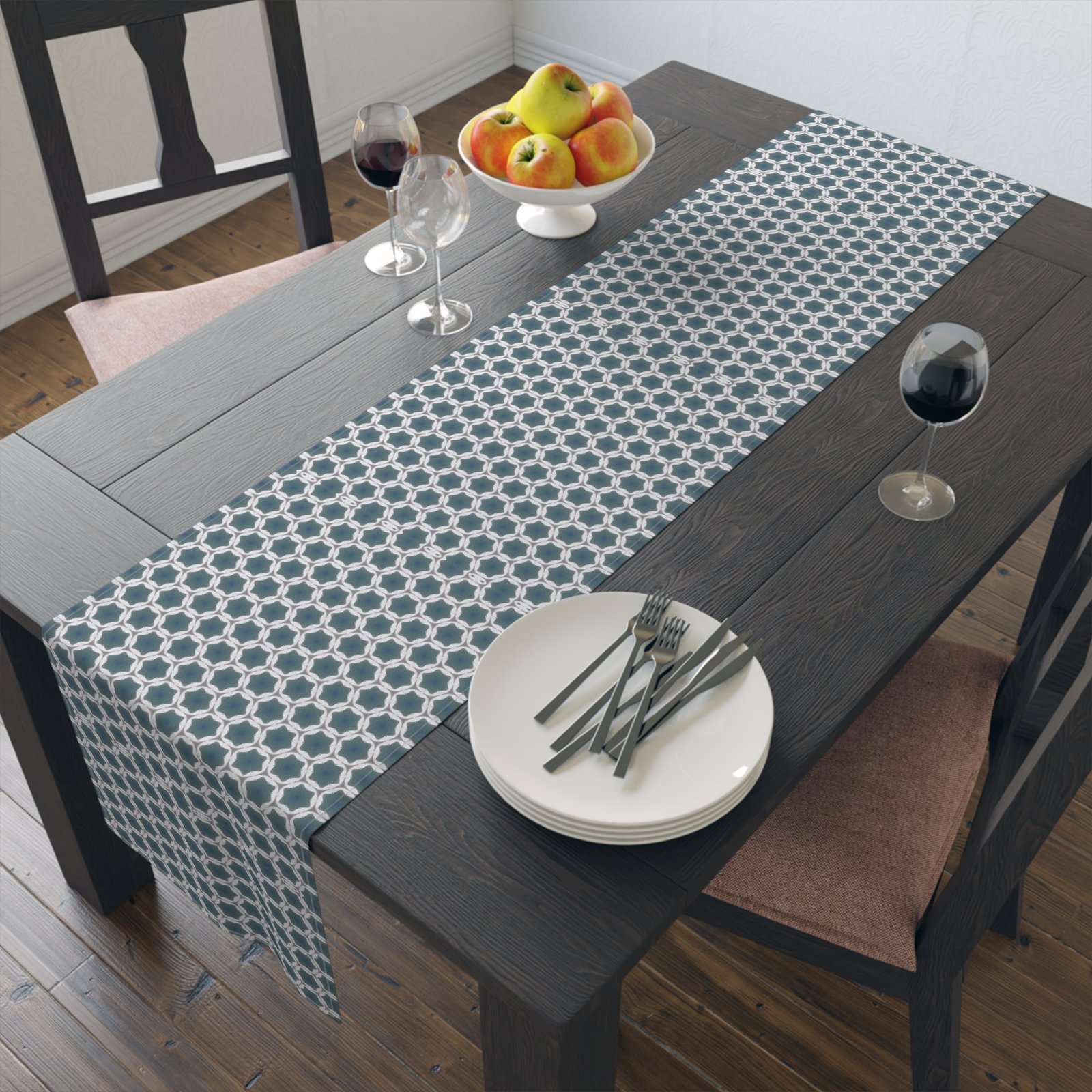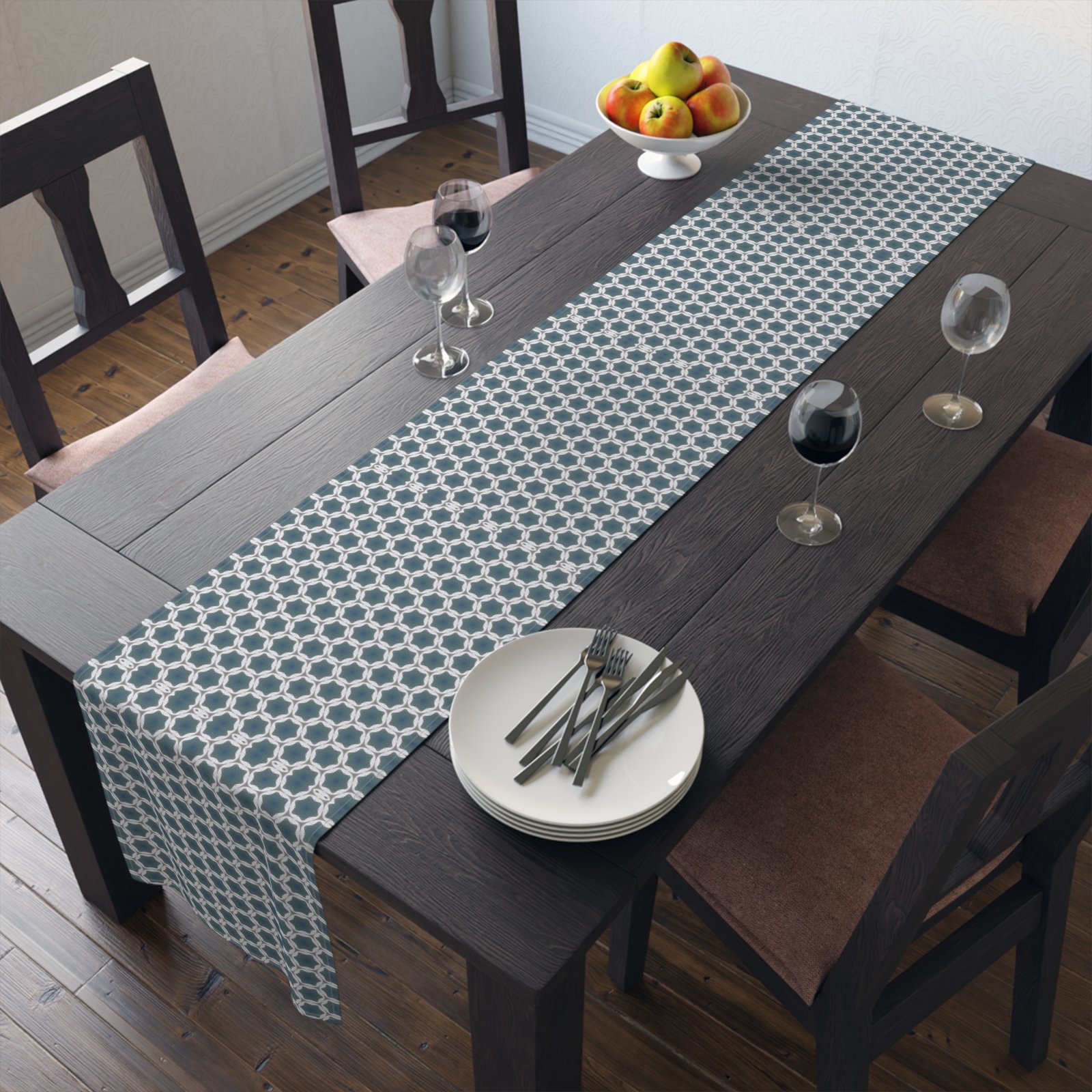 A refined table runner with a cool, geometric chain motif that adds quiet structure to your table. The subtle blue palette and repeated hexagonal links create a calm, contemporary look that slips easily into a coastal, modern, or Scandinavian setting. Laid over wood or marble, it brings a layered, collected feeling — the kind that invites lingering meals and slow conversation. Machine-made hems keep the edges neat through regular use, and the one-sided print lets the pattern take center stage without fuss. Choose the polyester option for vivid, long-lasting color and quick drying, or the cotton twill for a softer, slightly muted finish with classic textile texture.