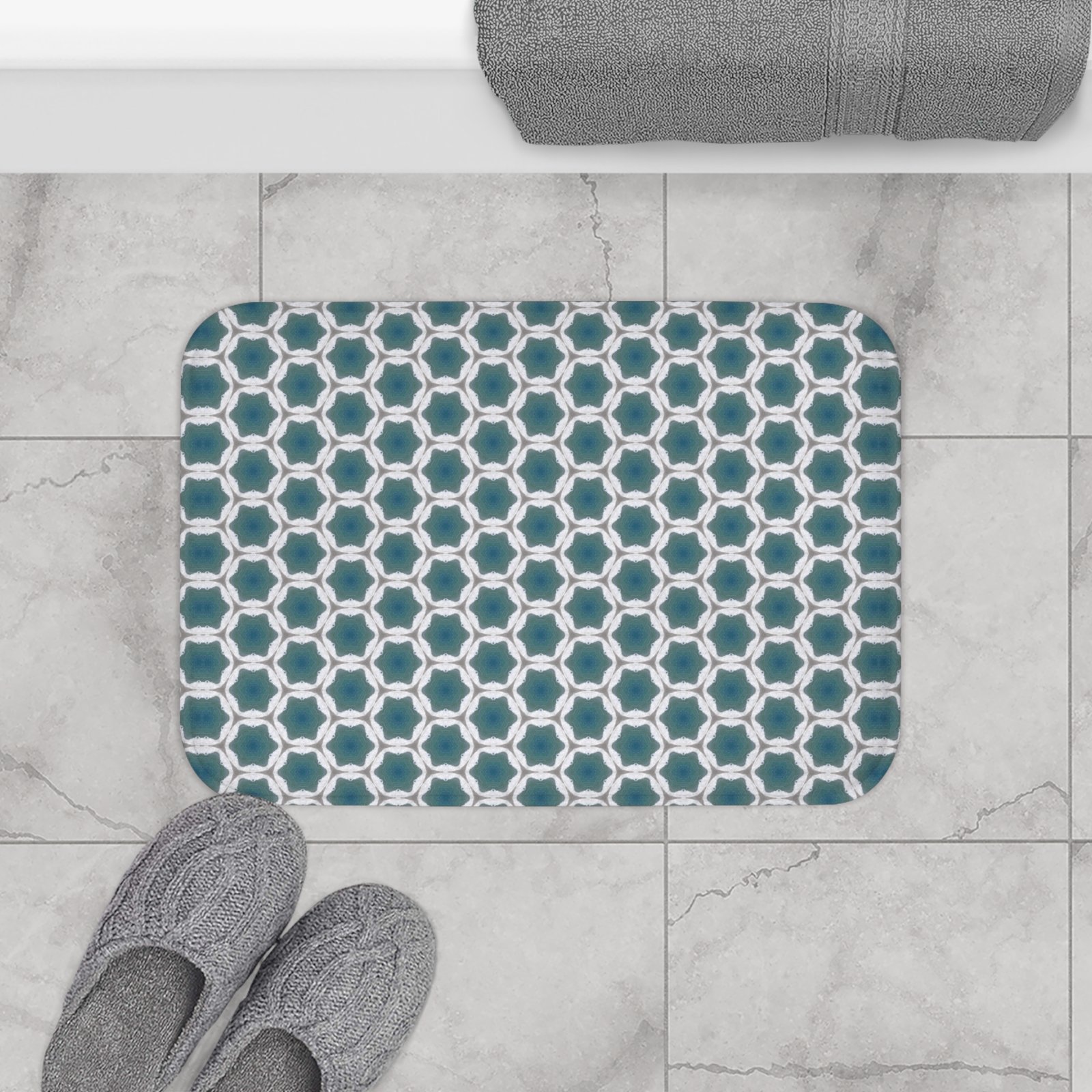Sink your feet into a quiet corner of comfort. This memory foam bath mat pairs thick, cushiony support with a tranquil blue watery pattern inspired by hand-drawn tiles. The microfiber top feels soft and absorbent underfoot, while the dense foam evens out pressure so stepping out of the shower becomes a small, grounding ritual. A secure, anti-slip backing and reinforced edge binding keep the mat laying flat and looking tidy through daily use. Brings a calm, collected energy to bathrooms that favor thoughtful details over loud statements.