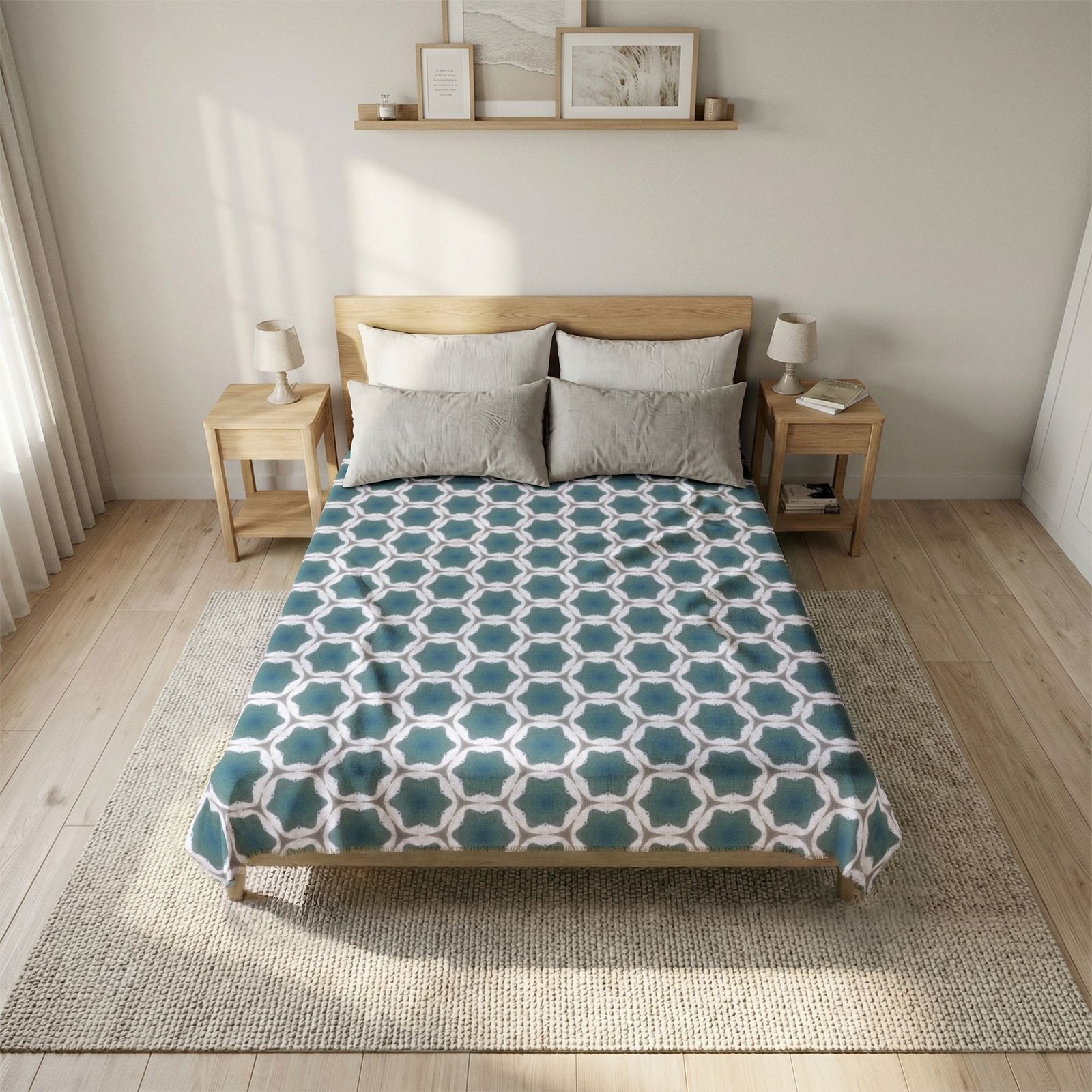 A lightweight, woven-style coverlet that brings handcrafted charm and graphic clarity to your bedroom. The geometric linked-circle pattern in cool pale blue and soft white creates a calm, collected mood across the bed, while the subtle white/grey woven reverse offers a layered look when folded at the foot. Breathable polyester with double square quilting keeps the coverlet structured without weighty bulk, and the 1″ printed fringe adds a finishing touch that reads both modern and artisanal. Sized for Twin, Queen, or King beds, this coverlet dresses a room with quiet geometry and lasting, fade-resistant color thanks to dye sublimation printing.
